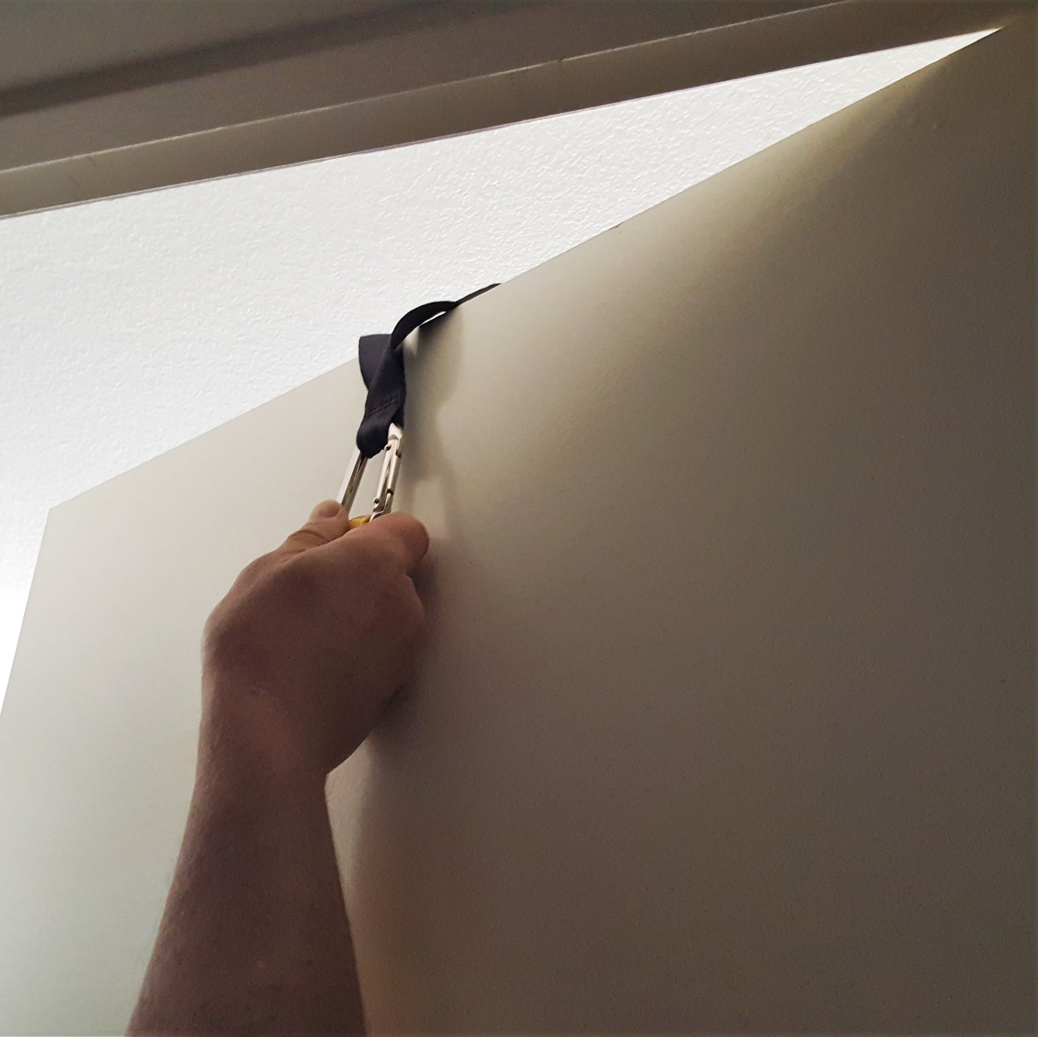 Use it on the "wrong" side of the door - when you workout you would pull the door "open". Simply place it over the corner at the hinges.Super light and compact - weighs only 1.5oz